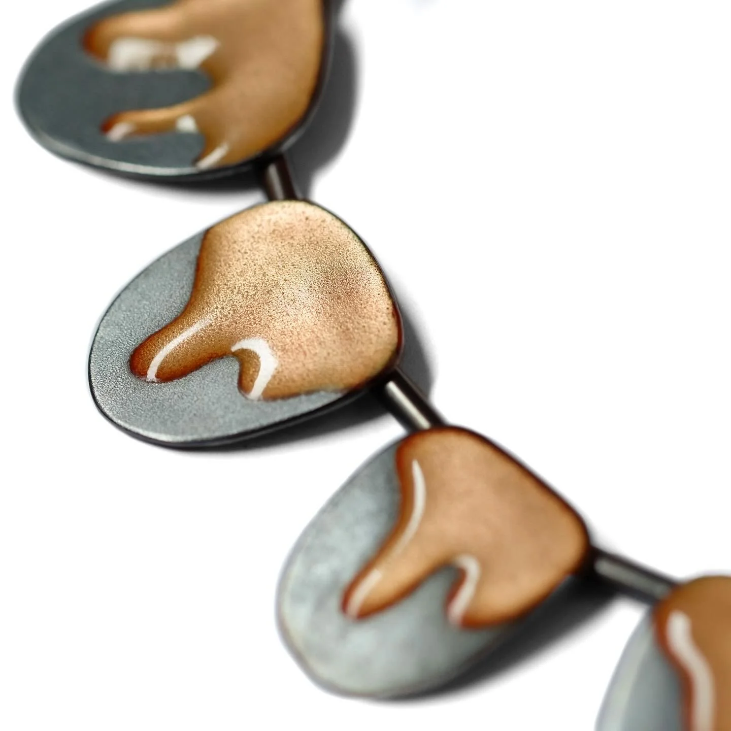Flux necklace #1 captures a transitional moment, a process underway. The solid enamel appears to be dripping and molten, the necklace seemingly frozen in time. The implication of change creates a sense of tension, uncertainty and unpredictability. Are we watching the piece’s creation or its deterioration? The shine of the enamel evokes a series of precious gems, despite their irregular forms. The necklace itself references the process of enamel application, which relies upon a solid-liquid state change, but is often carefully controlled.